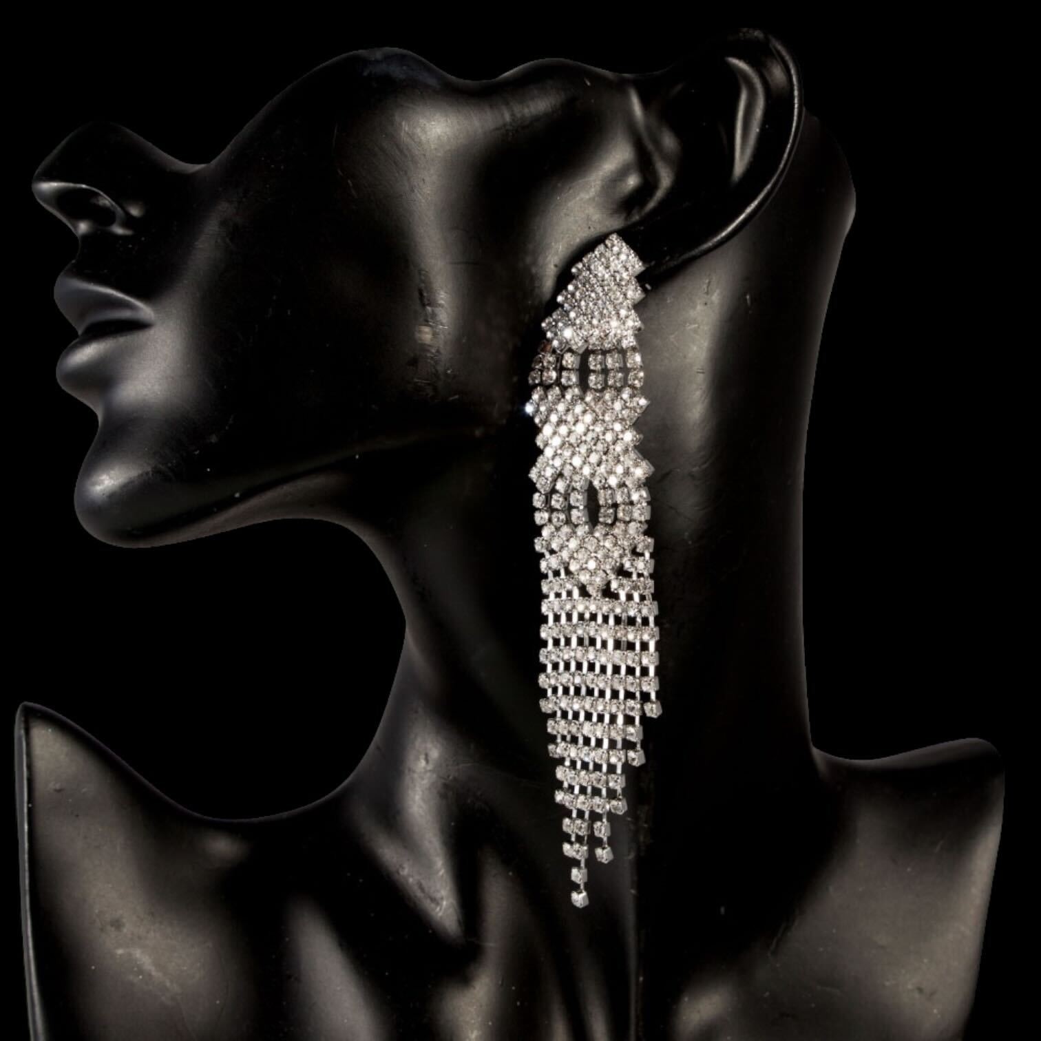 Boucles d'oreilles percées, strass blanc, représentant une cascade de strass. Légères et ultra-brillantes. Traitées anti-allergie, sans nickel. Longueur 12cm, Largeur 2cm.