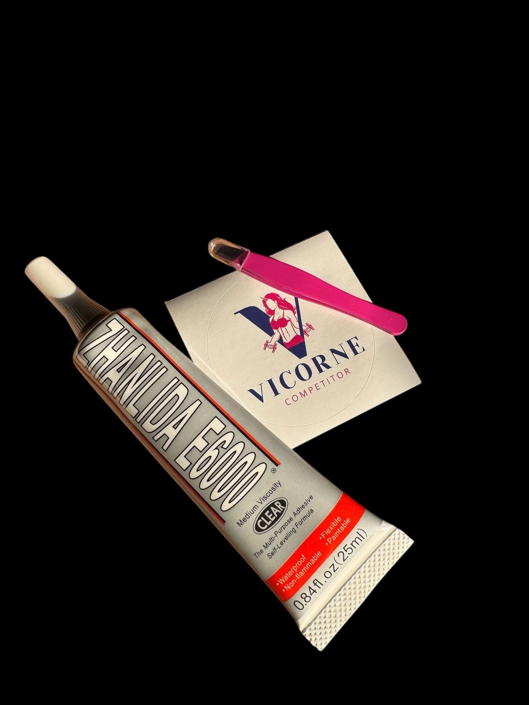 Colle spéciale strass avec embout fin adapté et petite pince pour attraper les strass.