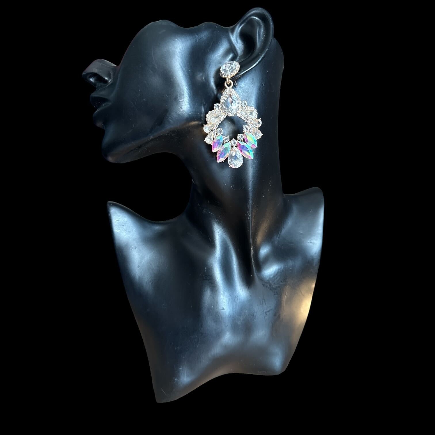 Sur monture or, la rondeur et la legereté d’une boucle ornée de strass diamants Ab ( multireflets) . 7 cm de longueur - Existe en violet et gold