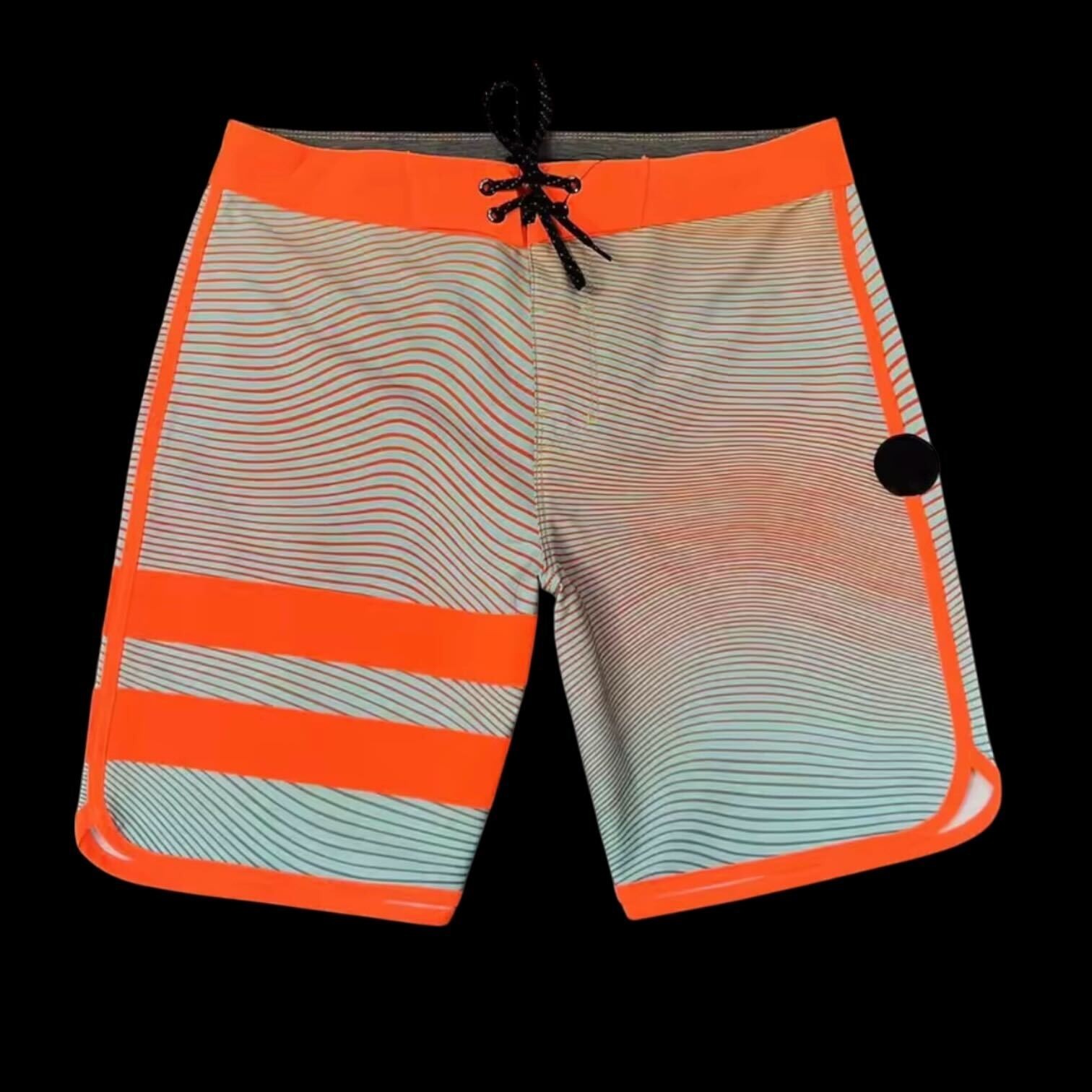 Sur fond sable, rayure orange vif. Ceinture orange et cordon de serrage. Coupe slim. Mise en valeur des galbes cuisses.